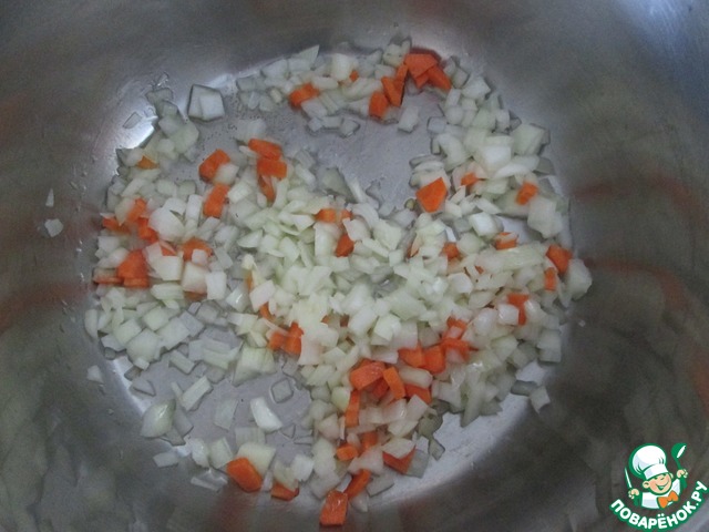 В большой кастрюле ( у меня 5 л.) разогреть на среднем огне пару ложек растительного масла и обжарить мелко порезанный лук и морковь. Обжариваем недолго, до прозрачности лука.