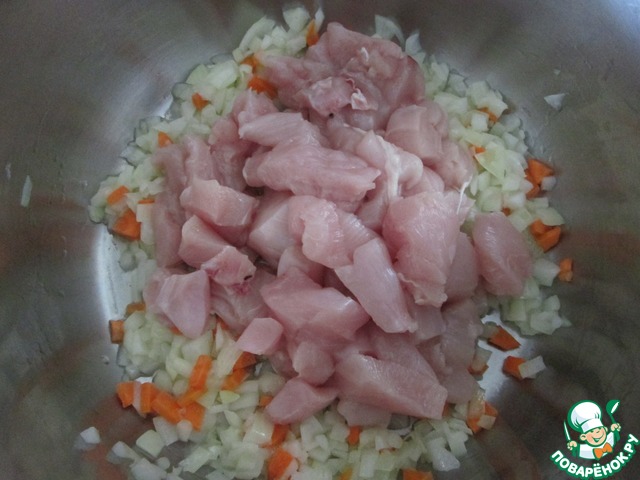 Затем добавить порезанную небольшими кусочками курицу и обжаривать еще минут 10, помешивая.