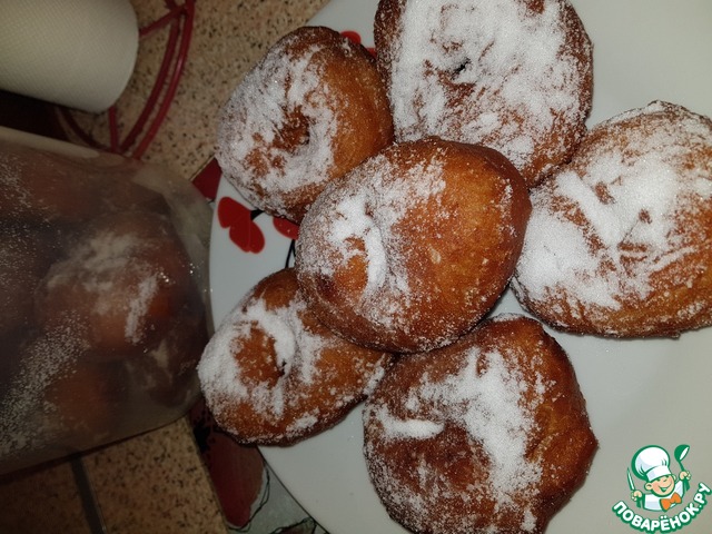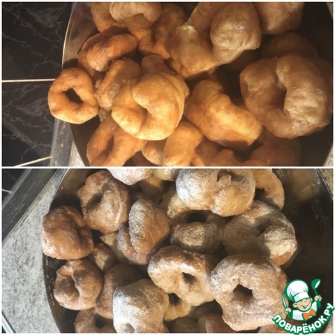 6. Хорошо разогреть масло в сковороде (огонь выше среднего). Каждый кусок теста аккуратно собрать в руку, сформировать по возможности шар, пальцем проткнуть дырку, сразу выложить во фритюр. Обжариваем с двух сторон до золотистого цвета. Готовые пышечки посыпать сахарной пудрой.
