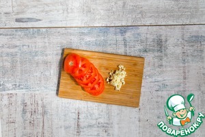 Измельчите чеснок. Помидоры нарежьте кружками толщиной 1 см.