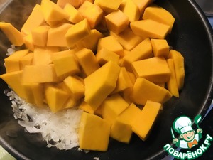 Добавить тыкву, закрыть крышкой, на тихом огне тушить 10 минут или до полуготовности тыквы. -