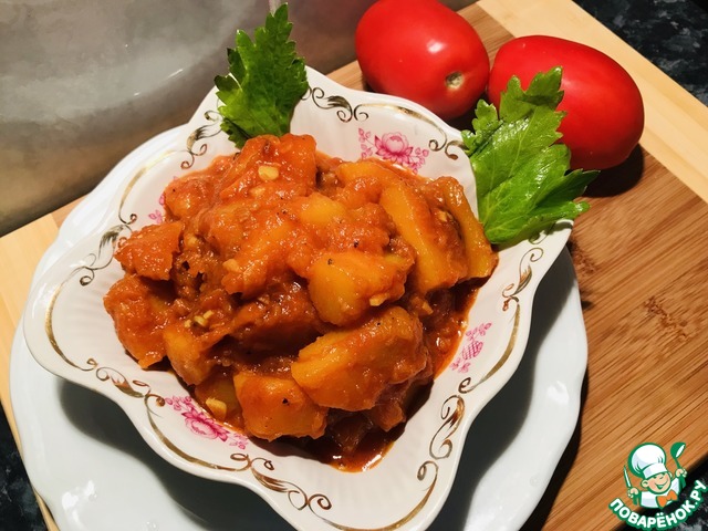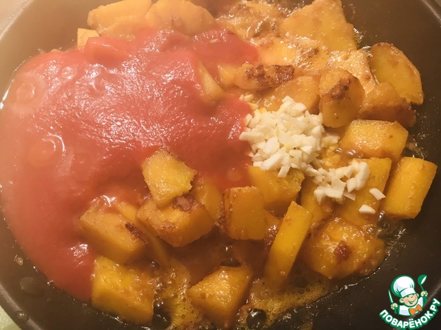 Добавить специи, размять тыкву вилкой (я этого не делала), добавить помидоры (у меня помидорный сок из банки), сахар, соль, перец чёрный, оставшийся чеснок, мелко нарезанный.