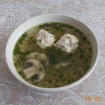 Бульон довести до кипения, добавить картофель и морковь, посолить. Варить 7 минут с момента закипания. Добавить грибы и фрикадельки, варить еще 10 минут. Подавать в горячем виде с зеленью. Приятного аппетита!
