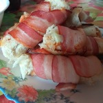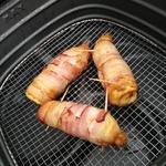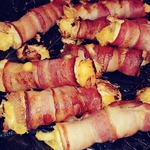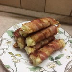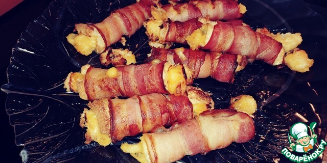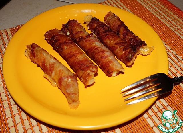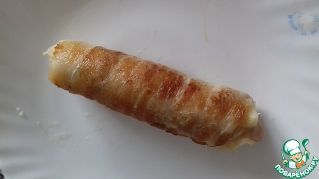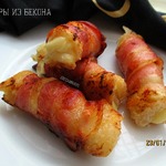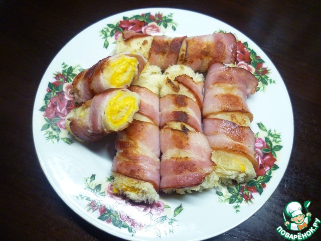 [+5]Хлеб еще немного смазала майонезом с перцем и чесночком. Бекон попался отличный, очень хорошо заворачивался, не ломался, слипался сам с собой, при жарке не развалился, даже зубочистки не потребовались. Жарила без масла, из бекона и так жир вытапливается. Из пачки (150гр) бекона и пачки сыра получилось ровно 8 штучек. Объедение!)))