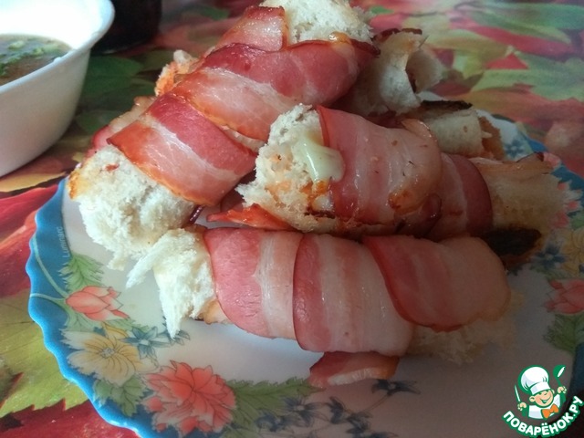 Некоторые пояснения по поводу количества ингредиентов. На один рулетик требуется 1 ломтик хлеба, 1 ломтик сыра и 1 ленточка бекона. Так что количество упаковок расчитывайте в зависимости от того, на какую ораву вы готовите. В 150г упаковке бекона примерно 8-9 полосочек. В упаковке сыра у меня 8 пластинок. Т. е. получится 8 рулетиков. Мне с головой хватает и двух. А вот муж может одолеть и все 8)