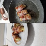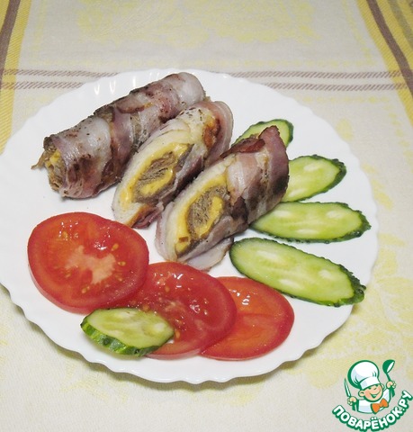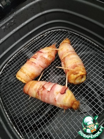 Рулетик оборачиваем ленточкой бекона. Начало и конец скрепляем зубочистками или шпажками. Разогреваем совсем немного растительного масла на сковороде и обжариваем рулетики со всех сторон.