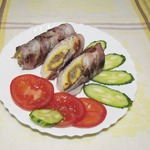 Всё просто. Берётся говяжья вырезка, нарезается поперёк тонкими пластинами. Эти пластины отбиваются до толщины папиросной бумаги. Начинка на любой вкус по желанию: чернослив, зелень, орехи, тёртый сыр - всё мелко режется.