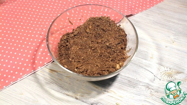 Добавить сахар, какао, перемешаем. Получившуюся крошку отправить в холодильник.