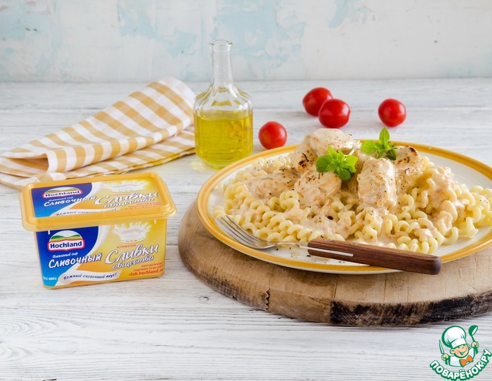 В сковороду выложите шалот и чеснок, обжарьте, 2 мин. Влейте сливки, доведите до кипения, добавьте плавленый сыр, поперчите. Размешайте до однородности, затем положите курицу. Доведите до кипения, уменьшите огонь до слабого, готовьте 5 мин. Подавайте горячими, с фузилли.