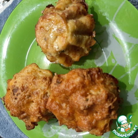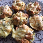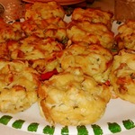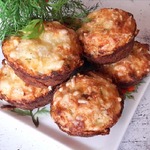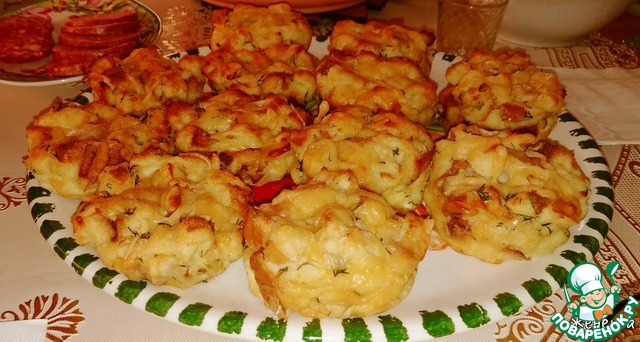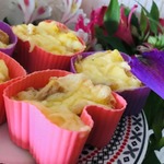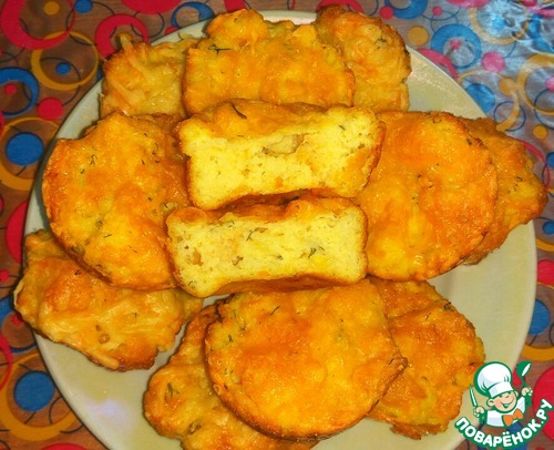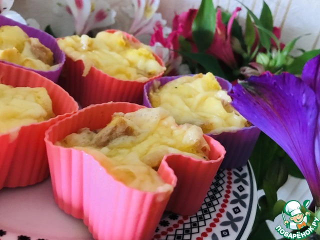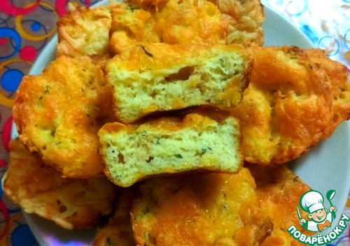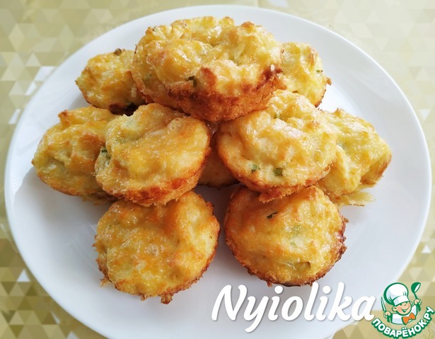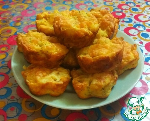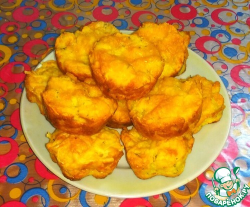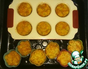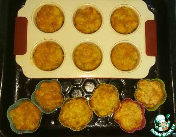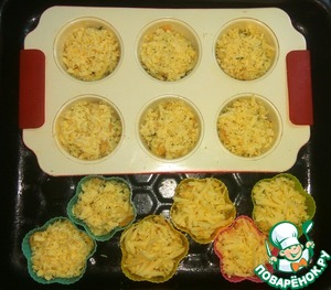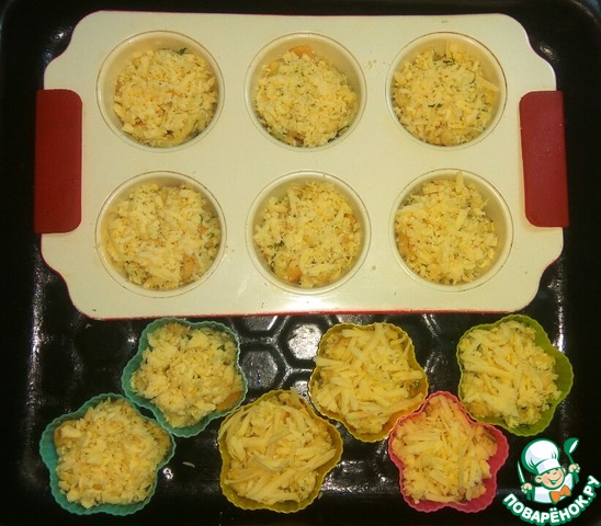 Формочки смазать маслом и присыпать манкой. Разложить приготовленную массу по формочкам. Формочки для маффинов заполнять на 2/3. Сверху посыпать оставшимся сыром.