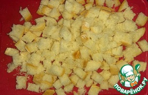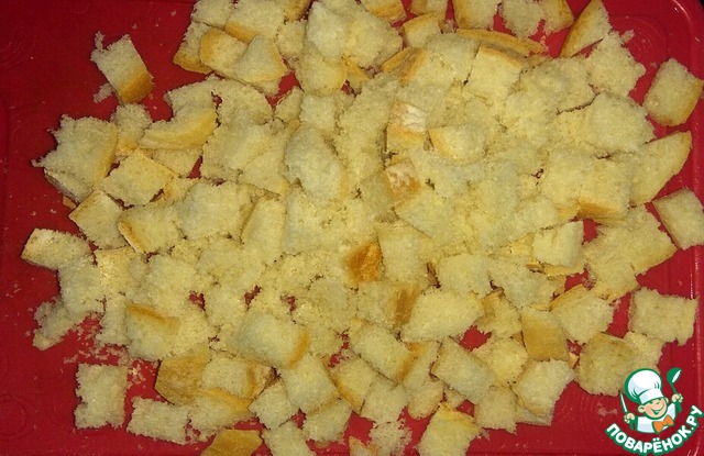 Белый хлеб или батон нарезать маленькими кубиками. Примерно по 0,5 см.
