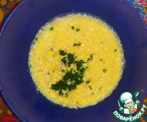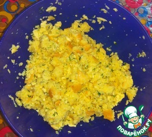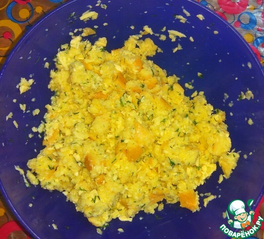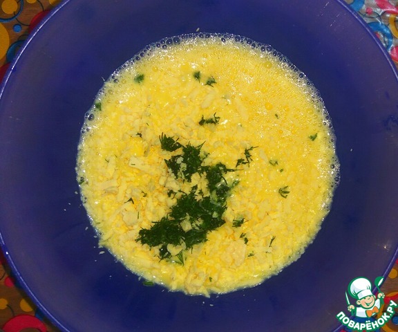 К яйцам добавить мелко нарезанный укроп и 70 г натертого на крупную терку сыра. Перемешать.