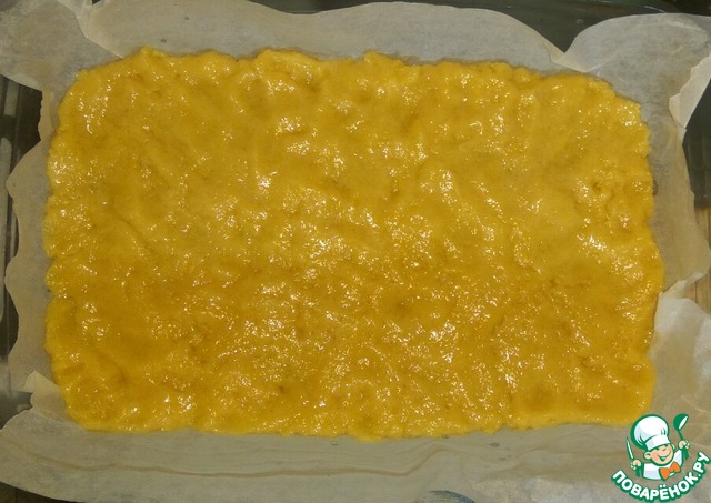 В застеленную пергаментом форму ложкой выложить песочное тесто. Разровнять влажными руками. Размер моей формы 20*30 см.