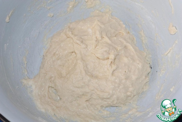 Первым делом ставим опару. Смешиваем 100 мл теплой воды, 100 г муки высшего сорта и дрожжи.