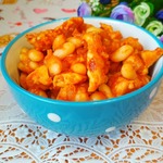 Если у вас фасоль без томатного соуса, можно добавить томатную пасту и немного сахара. -