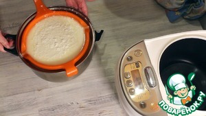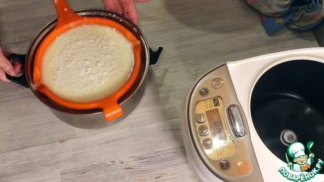 Перекладываем сырное зерно в дуршлаг или специальные формы. В течении следующих трех часов масса сама прессуется и уплотняется. Рекомендуется при этом переворачивать массу раз в полчаса.