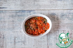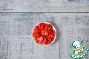 Помидоры обдайте кипятком, положите в холодную воду на 1 мин., снимите кожицу. Нарежьте помидоры кружками толщиной 2 см.