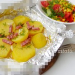 На смазанную часть фольги выложить картофель и целые зубчики чеснока, посолить и поперчить.
