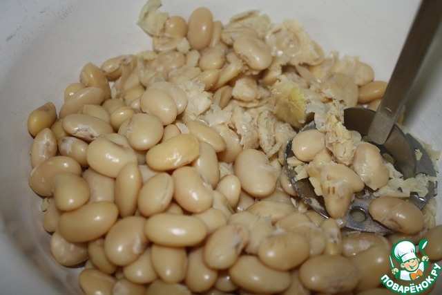 Итак, горячую фасоль толкем толкушкой, или перемалываем в блендере. -