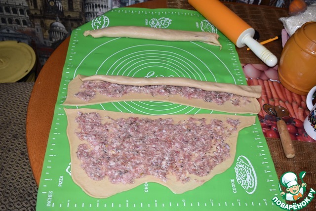 • Вымесить фарш с измельченным чесноком, солью специями. Тонко раскатываем тесто в овал или прямоугольник. Делим его на 3 части по более широкой стороне.