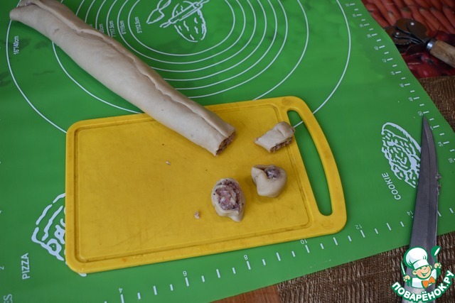 • Выкладываем фарш тонким ровным слоем на тесто. Отступаем от краев 1 см. Сворачиваем тесто с фаршем рулетом по более узкой стороне начиная от неровной стороны. Закрепить швы у рулетов. Я просто прокатываю рулет по доске рукой.
