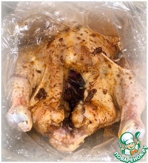 Курицу убрать в пакет и прямо в нем хорошо этой смесью натереть. Снаружи и изнутри.