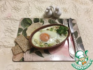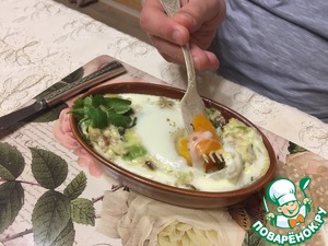 • Сверху разбить яйцо. Посыпать солью. Поставить в духовку на 200 гр до коагуляции белка. (До его побеления).