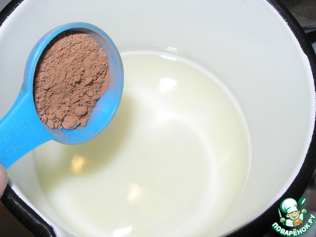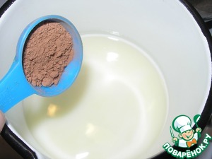 Теперь в сотейнике смешать 1 ст. молока, 1 ст. л. сахара, маленькую щепотку соли, 0,5 ст. л. какао-порошка и нагреть на маленьком огне, периодически помешивая.