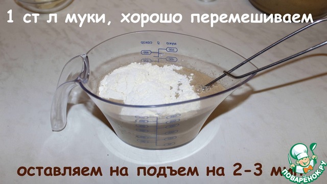 Добавляем 1 ст л муки и хорошо перемешиваем. Оставляем на подъем на 2-3 минуты.