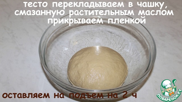 Тесто перекладываем в чашку, смазанную растительным маслом. Прикрываем пленкой. Оставляем на подъем на 2 ч.