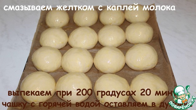 Смазываем желтком с каплей молока. Выпекать при температуре 200 градусов 20 минут. Чашку с горячей водой оставляем в духовке.