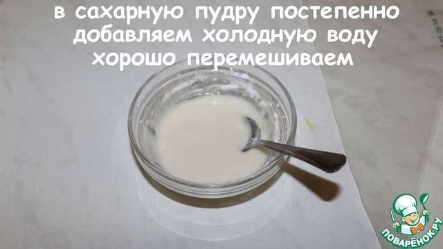 Готовим глазурь. В сахарную пудру постепенно добавляем холодную воду. Хорошо перемешиваем.