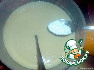 Добавляем к взбитым яйцам 300 мл кефира и апельсиновый сок. Кладем чуть меньше чайной ложки соды, гасить не нужно, кислоты кефира и сока больше чем достаточно. Добавляем цедру апельсина и чайную ложку с горкой свежемолотого кофе. Перемешиваем.