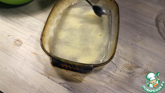 Смазываем форму сливочным маслом, посыпаем манкой.
