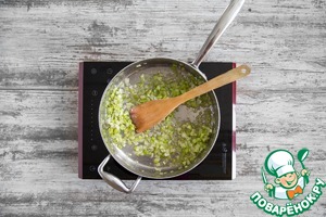 Очень мелко нарежьте чеснок и порей. В большой кастрюле растопите масло, положите порей и чеснок, немного обжарьте.