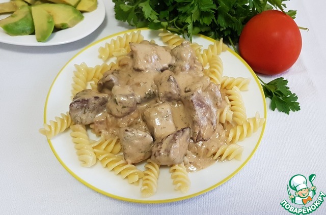 С печенки снимаем пленку, нарезаем и обжариваем вместе с луком.
