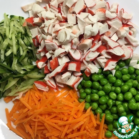 Крабовые палочки нарезаем кубиком. Горошек размораживаем и сливаем образовавшуюся воду. -