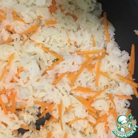 Рис промываем и отвариваем до готовности, промываем холодной водой, просушиваем в дуршлаге, вливаем 1 ст. л. растительного масла для рассыпчатости, перемешиваем.