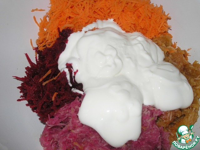 • Натёртые свеклу, морковь, яблоки переложить в большую миску. Редьку отжать от выделившегося сока и добавить к остальным ингредиентам.