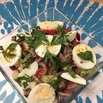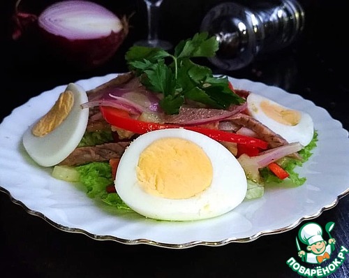Мясо нарезать тонкой соломкой, добавить к салату. Всыпать специи и влить масло. Лук отжать от маринада и выложить к салату. Перемешать. В тарелку выложить произвольно нарезанные листья салата, сверху салат. Яйцо очистить и нарезать тонкими слайсами, выложить по кругу салата. Украсить петрушкой.