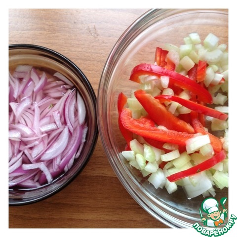 Лук нашинковать полу кольцами и замариновать на минут 20. Для маринада: в холодную кипяченую воду 100 мл добавить уксус и сахар, перемешать и выложить туда лук.