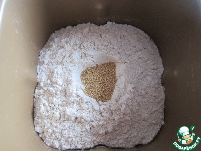 ... затем мука и дрожжи. Из данного количества продуктов получается буханка весом в 750г. Включить программу "Цельнозерновой хлеб".