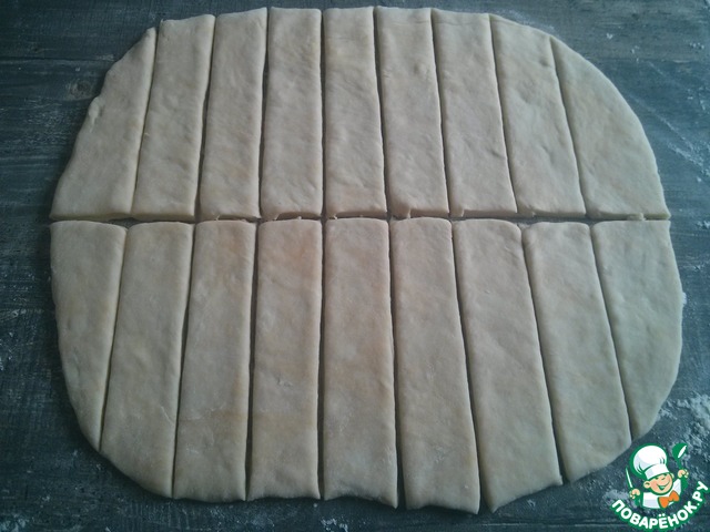Затем тесто раскатать в пямоугольник примерно 0,5-0,7 см. толщиной, разрезать вдоль пополам, потом поперек на полоски примерно в 2 см.