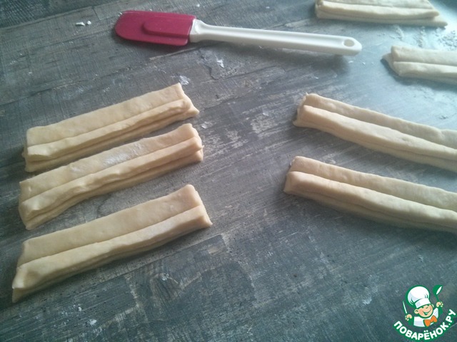 Слложить тесто по две полоски: одну на другую. Затем шпажкой или другим предметом прижать середину теста, таким образом скрепляя полоски теста. Я делала это силиконовой лопаткой.