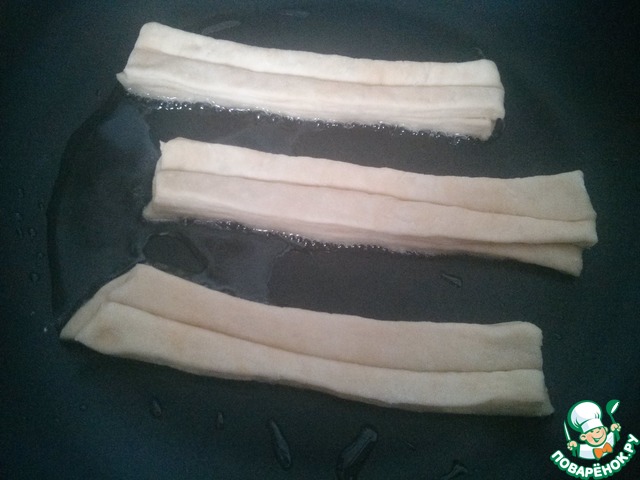 Разогреваем на сковороде растительное масло, чуть растягиваем палочки (приблизительно на треть от их первоначальной длины) и обжариваем с каждой стороны. Обжаренные палочки выкладываем на бумажное полотенце, чтобы удалить излишки масла.