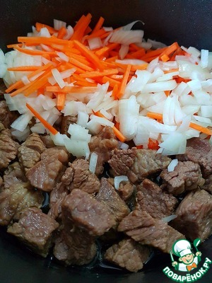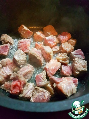 Мясо нарезать небольшими кубиками и обжарить, помешивая, около 2х минут. Добавить немного воды, посолить и тушить на медленном огне под закрытой крышкой до готовности, периодически подливая небольшое количество воды, чтобы мясо не пригорело. -
