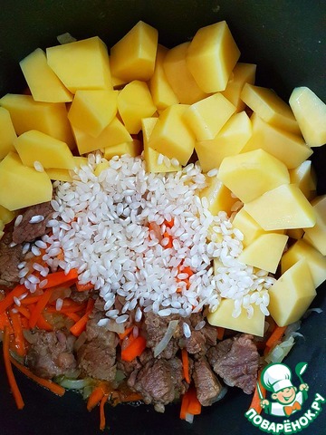 Картофель нарезать небольшими кубиками, рис промыть. Отправить в кастрюлю.