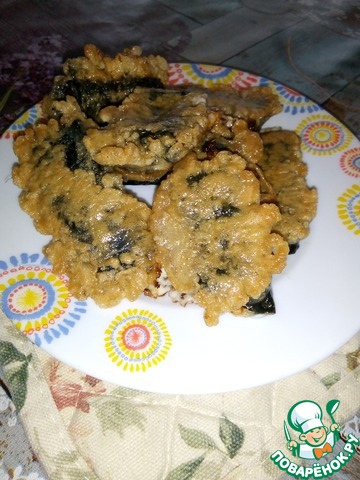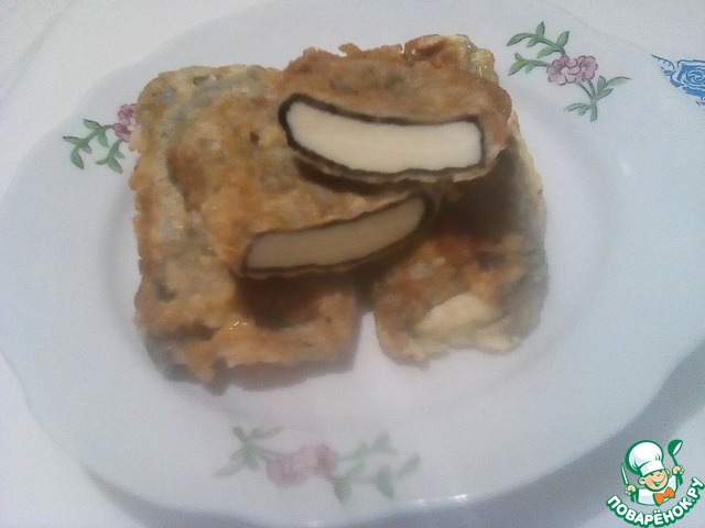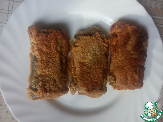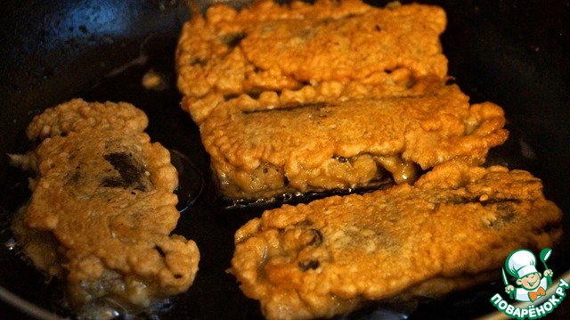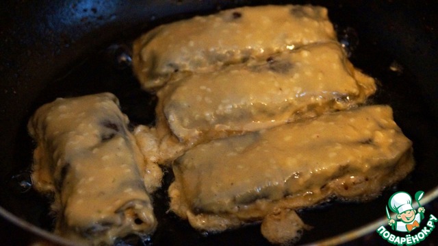 Обмакиваем завернутые кусочки в кляр и выкладываем в разогретое масло на сковороду. Обжариваем до румяной корочки одну сторону...