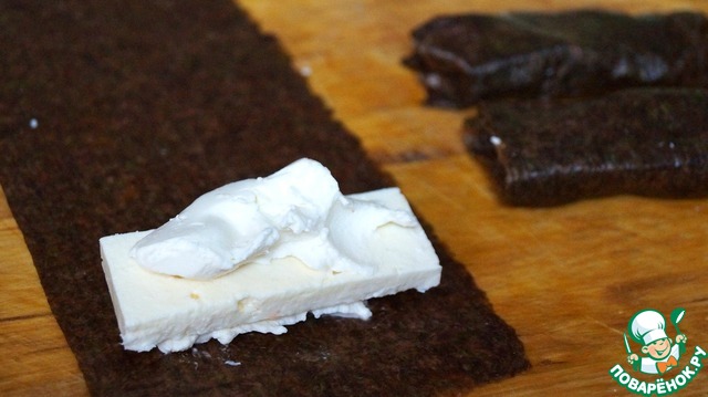 На влажные листы нори выкладываем полоску сливочного сыра. Делается это, чтобы смягчить соленость основного сыра, если он соленый, а если сыр пресный, то сливочный сыр не нужен.