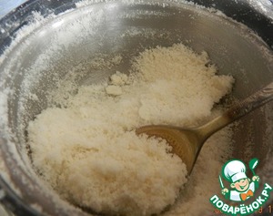 Очистить наш запаренный миндаль от кожуры, после кипятка она очень легко снимается. Положить миндаль в кофемолку (измельчитель) с 1,5 ст. л. сахара и максимально измельчить (у меня получилась мучная крошка, маслянистая на ощупь)